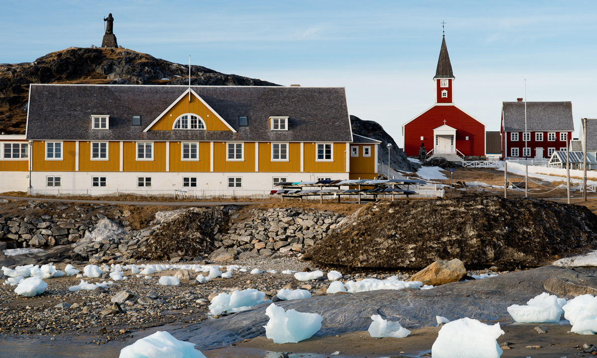 L’interno della Groenlandia è dominato da vaste formazioni glaciali, note come «calotta glaciale groenlandese», che coprono circa l’81% dell’isola[3]. Inoltre, gran parte della superficie restante è soggetta a copertura nevosa permanente. Di conseguenza, gli insediamenti umani si sono concentrati soprattutto lungo le coste, caratterizzate da profondi fiordi, che dal mare penetrano nell’entroterra.
