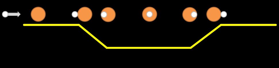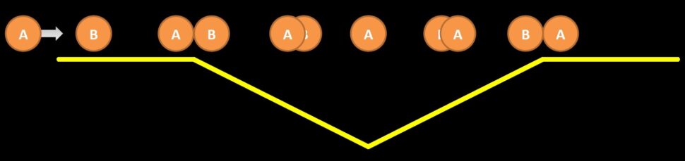 Per fare un esempio semplice, supponiamo che un asteroide binario sia composto da due componenti identiche, A e B, e che A passi davanti a B da sinistra, come mostrato nello schema qui sotto. Quando A comincia a eclissare B, la luminosità totale osservata del sistema (linea gialla) inizia a diminuire, fino a quando A copre completamente B; a quel punto la luminosità ricomincerà ad aumentare fino al valore massimo, quando entrambi i componenti torneranno pienamente visibili. Quando A prosegue il suo moto e passa dietro B da destra, l’effetto sarà identico.